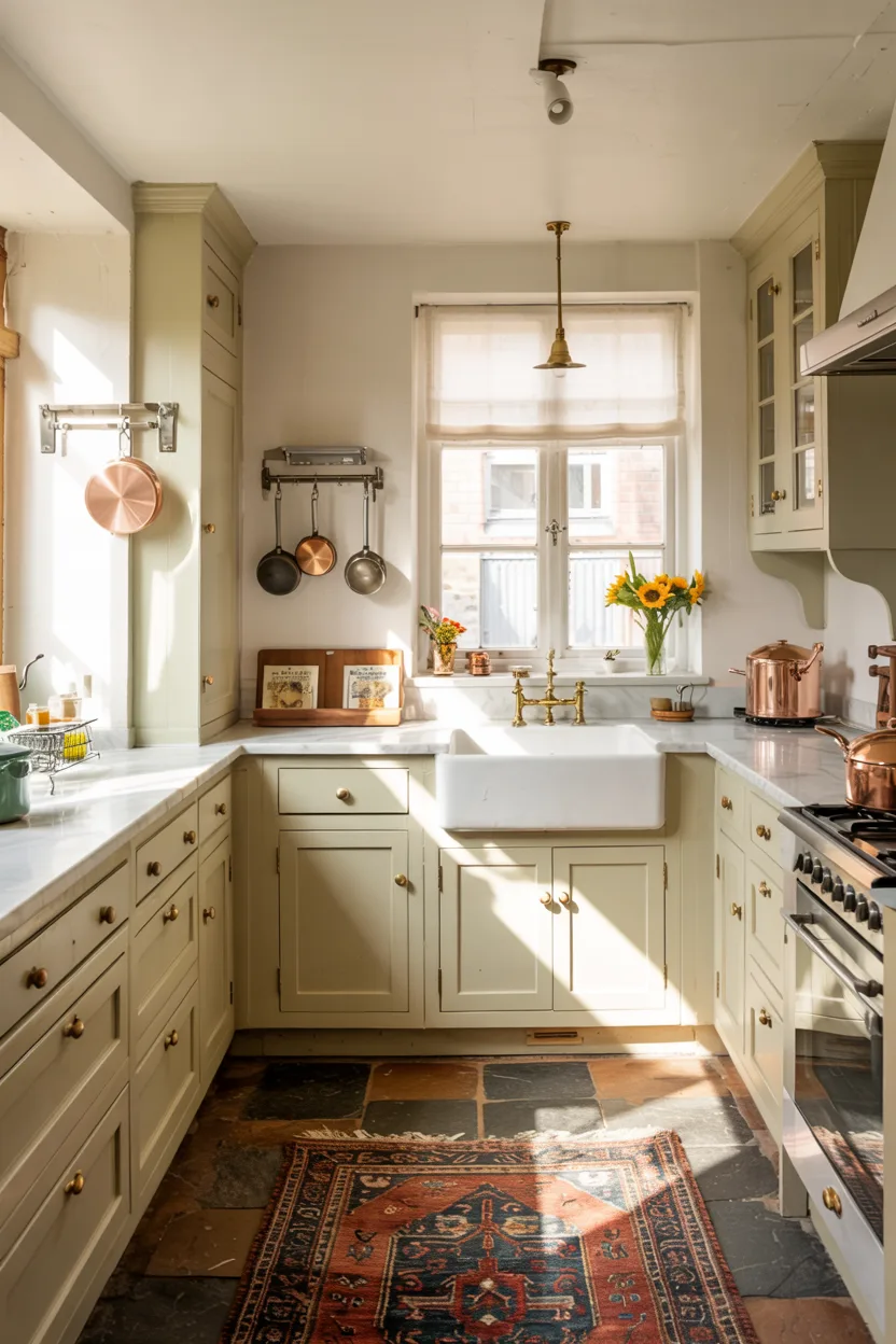 For galley kitchens: Paint the short end wall a slightly darker shade to “push” it back. In L-shaped kitchens, keep the corner open with a small round table instead of a bulky square one.