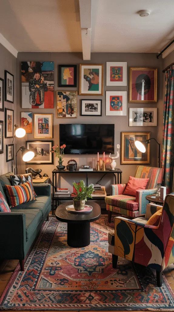 I’m an art lover, so I turned one wall into a gallery. I arranged eclectic frames around a central TV or mirror, with a slim console table below for decor. The sofa faced this focal point, creating a visually engaging layout that sparked conversation.