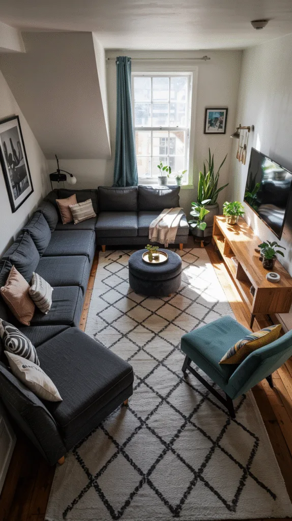 My awkwardly shaped living room needed a smart solution, so I used an L-shaped sectional to hug the walls. This maximized seating while leaving the center open for a small rug and ottoman, making the space feel larger than it was.