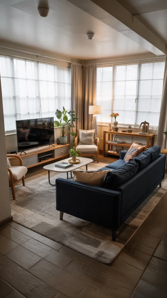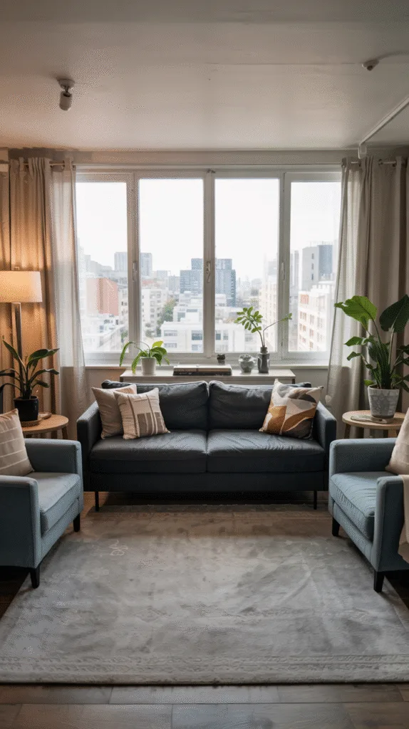 My apartment has a stunning view, so I oriented my sofa to face the window. A pair of armchairs flanked it, and a slim console table behind held plants and decor. This layout maximized natural light and made the room feel expansive.