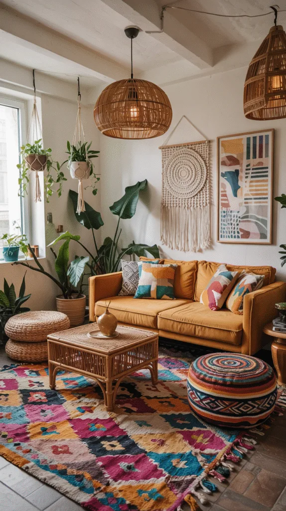 I went all-in on boho vibes with a mix of textures and patterns. A low sofa with colorful cushions sat on a vibrant rug, paired with floor poufs and a wicker coffee table. Hanging plants added a touch of nature to complete the free-spirited look.