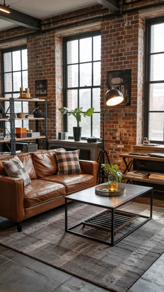 Inspired by city lofts, I chose a leather sofa and metal-framed coffee table for an industrial feel. Exposed brick (or faux brick wallpaper) and a large floor lamp gave the room an urban edge, with a rug softening the look.