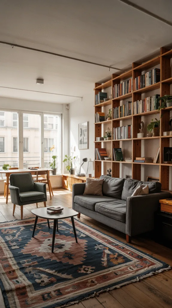 In my open-plan space, I used a tall bookshelf to separate the living room from the dining area. I placed a sofa against the bookshelf, facing a small coffee table and armchair, creating a cozy reading nook with built-in storage.