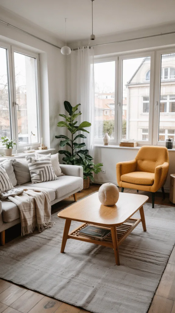 I fell in love with Scandinavian design for its clean lines. I chose a light wood coffee table, a white sofa, and a knitted throw for warmth. A single bold accent chair in mustard yellow added a pop of color without overwhelming the space.