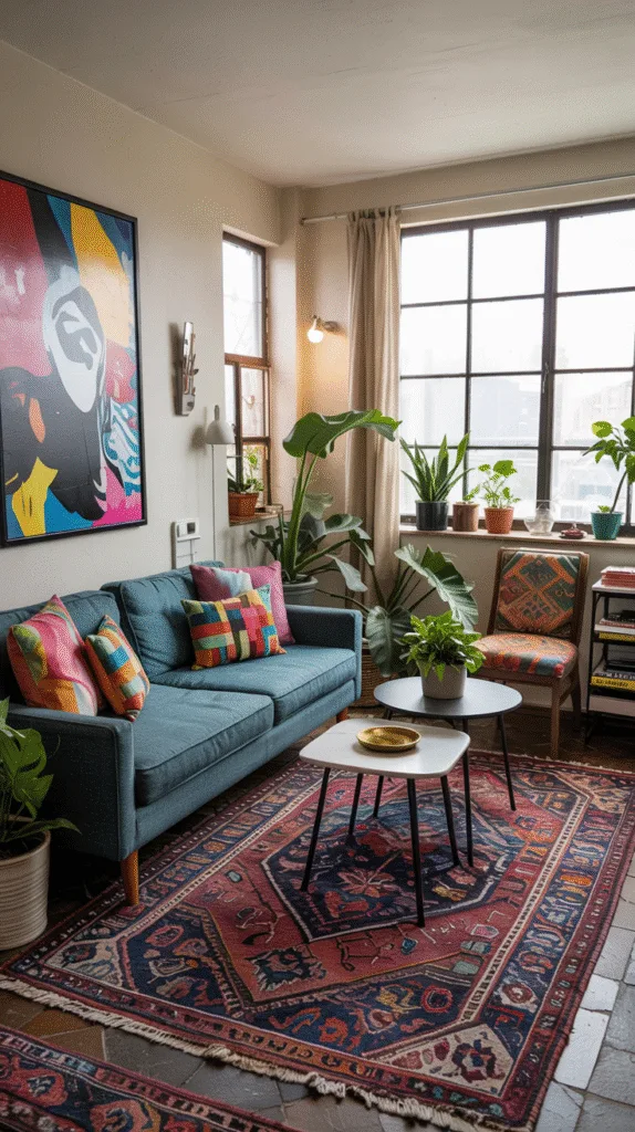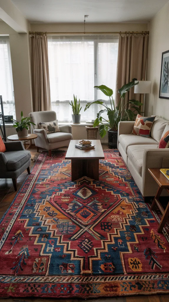 A bold, oversized rug became the centerpiece of my living room. I arranged a sofa and two chairs around it, ensuring all furniture touched the rug’s edges. This grounded the space and added a splash of color.
