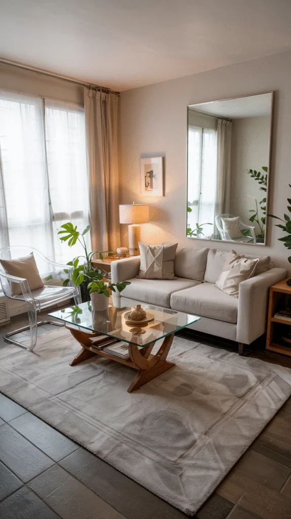 To make my tiny living room feel bigger, I used a glass coffee table and acrylic chairs. A large mirror on one wall reflected light, and a light-colored rug kept the space bright and open.