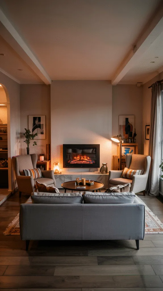 My apartment’s fireplace inspired this layout. I placed a sofa directly across from it, with two armchairs angled on either side. A small rug and coffee table completed the cozy, inviting setup.