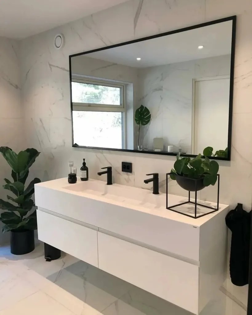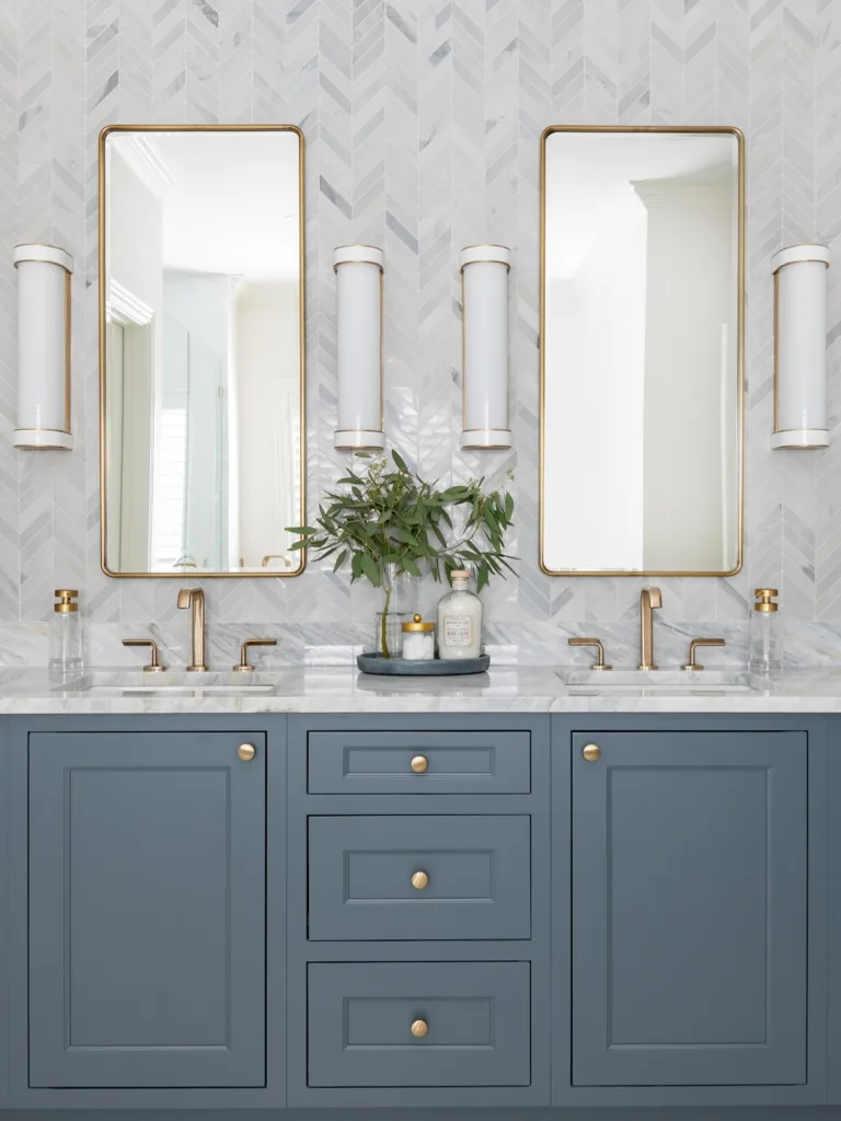 - Two Tall Vertical Panels – Floor-to-ceiling narrow mirrors flanking the vanity—makes ceilings soar.