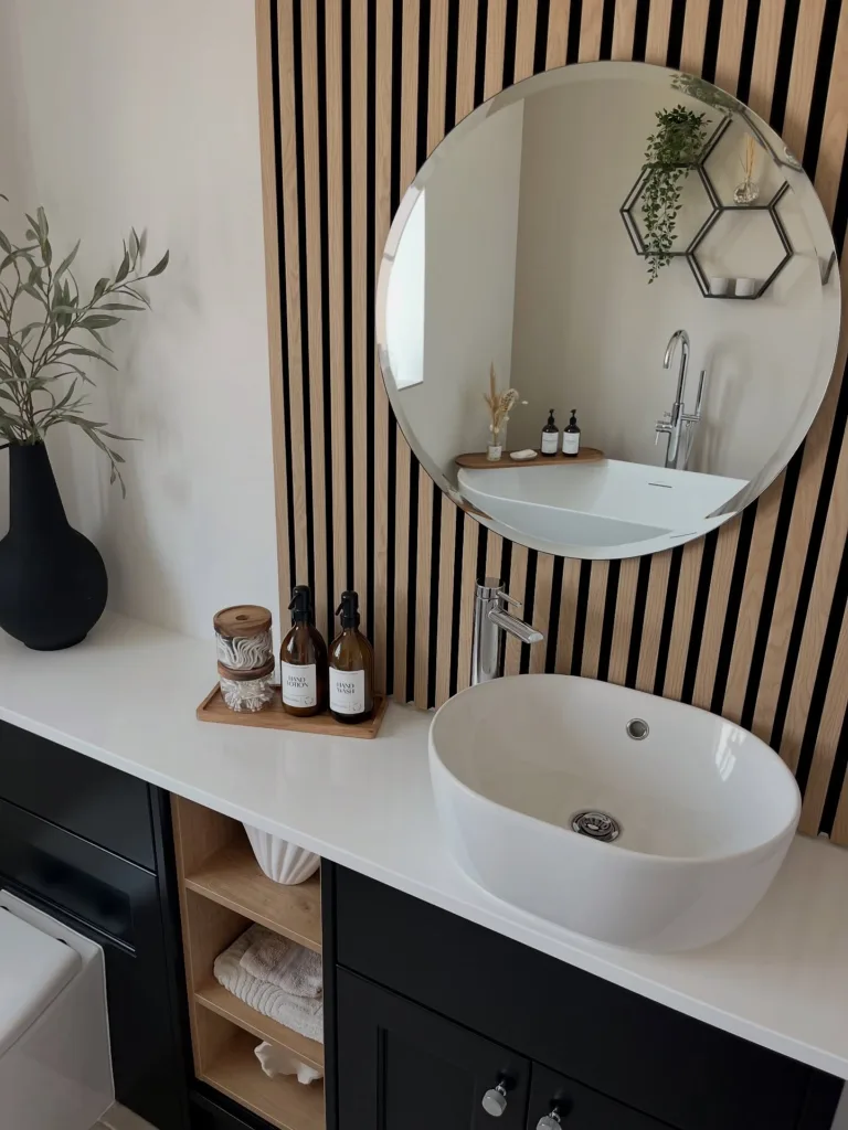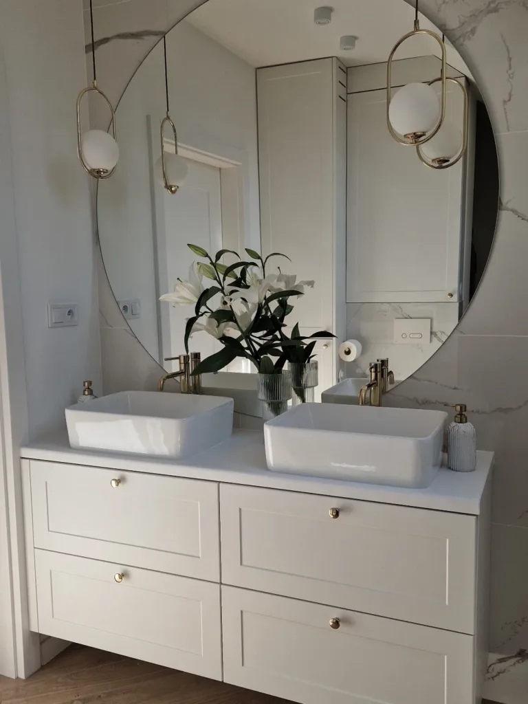 Measure twice: standard height is 36–42 inches from countertop to mirror bottom; center at eye level (average 60–65 inches). For double vanities, leave 4–6 inches between mirrors or use one continuous piece. Lighting must be planned with the mirror—flank with sconces or choose backlit models. Choose shape first (round softens, rectangular sharpens, organic calms). Weight matters: large mirrors need proper wall anchors or French cleats. Finally, consider steam: defogging pads or backlit LED mirrors are non-negotiable in shower-heavy homes.