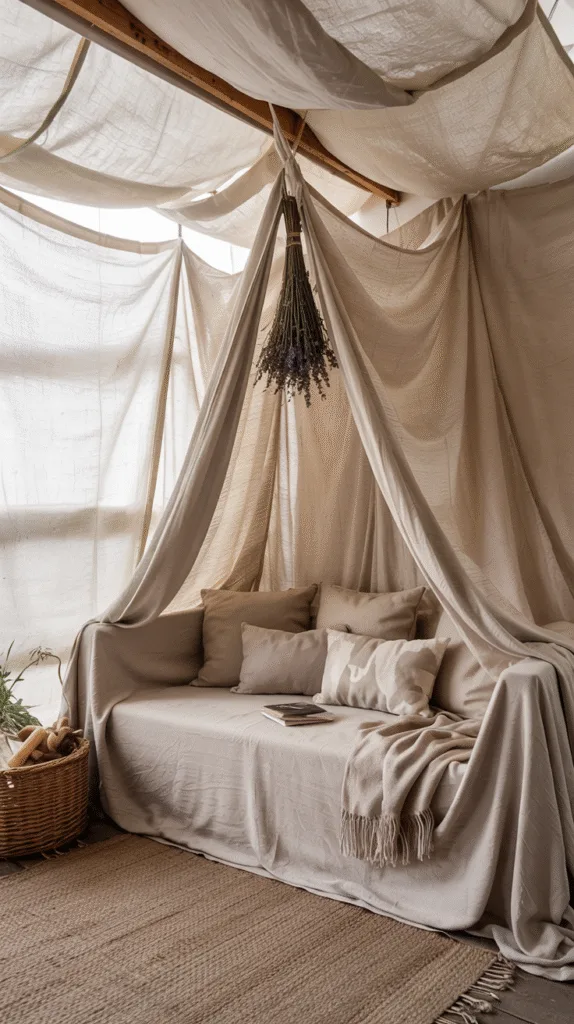 Envelop your seating area in ethereal softness with this makeover, crafting a linen canopy that filters the world into golden-hour dreams. Sew or tie panels of undyed, breathable linen—harvested from flax fields and softened by time—draping them from ceiling hooks to form a loose teepee over your sofa, edges frayed for that signature Boho ragged charm. Infuse with earth scents by tucking dried lavender bundles into the folds, their purple whispers peeking through like hidden jewels. This idea variant excels at zoning open-plan spaces, creating intimate nooks for movie nights or meditation, where the fabric’s subtle sway responds to breezes from open windows. It’s a tactile embrace of simplicity, softening harsh light and acoustics while evoking Moroccan riads or desert tents, ultimately weaving a veil of peace that makes every gathering feel like a private sunset soiree.