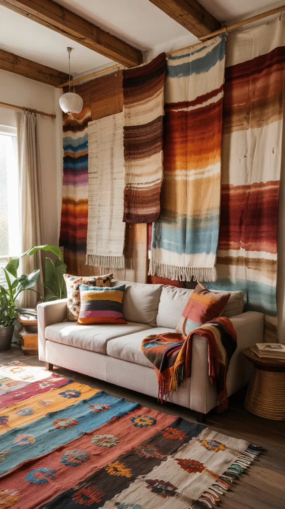 Wrap your walls in narrative warmth with oversized, hand-dyed tapestries in a palette of rusts and umbers, this makeover layering fabrics like earth’s stratified soils. Hunt thrift stores for woolen kilims or block-print cottons—vintage finds faded by sun—hanging them overlapped from brass rods for a bohemian collage that absorbs sound and adds insulation. Fringe the bottoms yourself with scissors and knots, then tuck in personal mementos like embroidered patches from travels. This variant softens acoustics in echoey lofts, creating a cocoon of color that evolves with light—fiery at dawn, subdued at dusk—while the fibers’ heft grounds floating furniture. It’s a canvas for cultural fusion, blending Persian motifs with Navajo weaves, ensuring your living room pulses with stories as rich as the dyes that stain them.