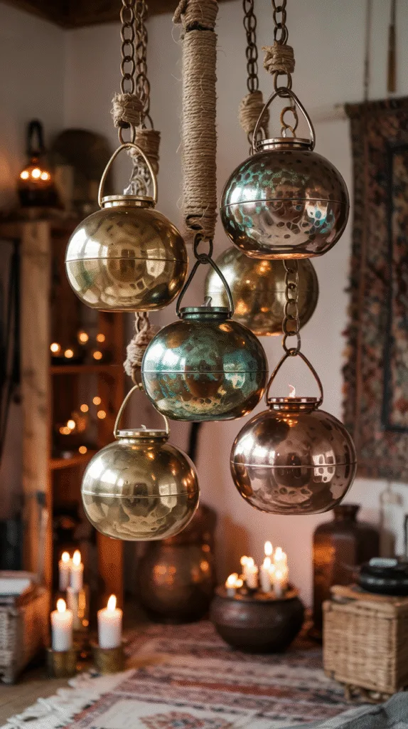 Illuminate with alchemical allure using clusters of vintage brass orb lamps, hand-hammered vessels that cast a patinaed glow in this earthy Boho transformation. Polish thrifted lanterns to reveal their verdigris veins—echoes of oxidized copper mines—suspending them at staggered heights with chain links wrapped in jute for a rustic tether. Fill bases with beeswax candles or low-watt bulbs to flicker like distant campfires, their warm light pooling on woven rugs below. This idea variant banishes shadows in dim corners, enhancing jewel-toned accents while the metal’s mellow shine adds subtle luxury to the organic palette. It’s a nod to nomadic traders, where each dent tells of journeys, fostering evenings of intimate ambiance that make reading nooks irresistible portals to other worlds.
