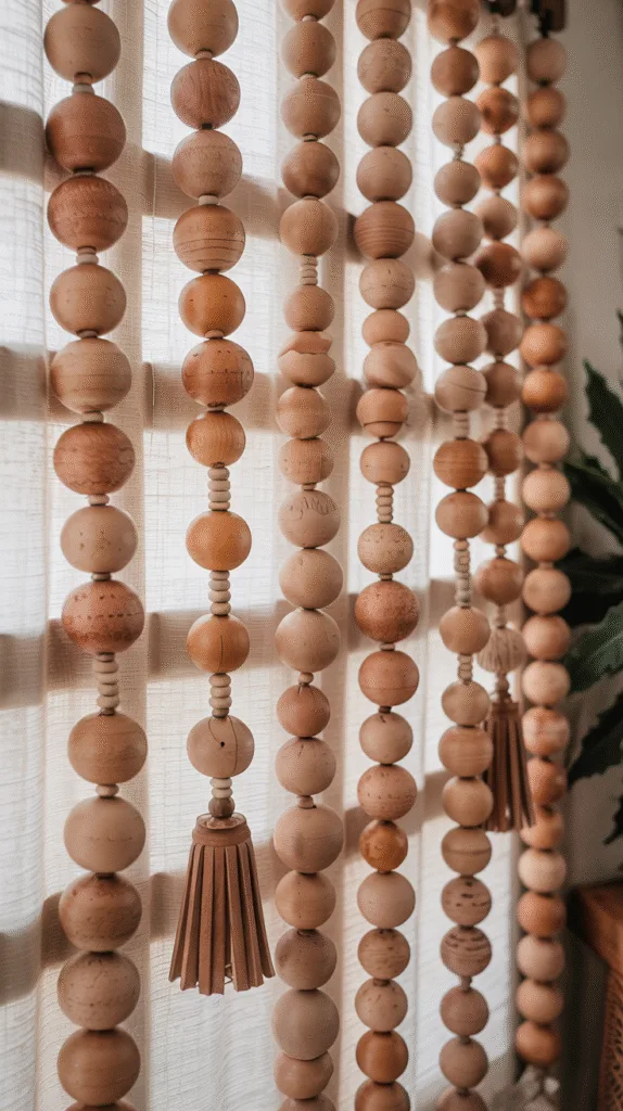 Adorn windows with garlands of hand-rolled clay beads, this makeover stringing sun-baked orbs in gradients of sienna and ochre for a Boho curtain alternative. Roll polymer or air-dry clay into imperfect spheres—bake low for authenticity—threading them onto leather cords with wooden spacers for rhythmic spacing. Drape across rods or from pelmets, parting like prayer beads to frame views. This earthy layer diffuses light into rosy veils, filtering urban glare while the beads’ weight ensures graceful sway. Ideal for privacy without darkness, it evokes Native American talismans, inviting tactile play and seasonal swaps—add bells for chimes. Ultimately, it’s a wearable wall of whimsy, where each bead holds the heat of creation.
