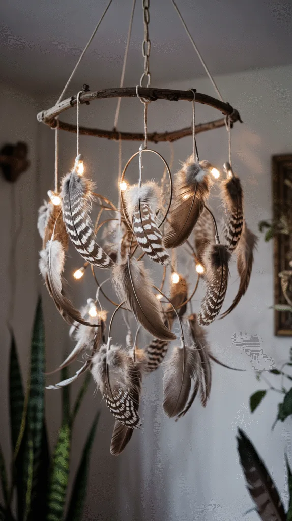 Forge a chandelier from foraged feathers and seed pods, this Boho Living Room Makeover Ideas suspending a cascade of nature’s discards in ethereal elegance. Glue quail plumes and milkweed husks onto wire hoops—layered in ascending sizes—hanging from a driftwood branch with waxed linen thread. Flicker with embedded LEDs for safe sparkle, their soft illumination mimicking moonlight through leaves. This overhead oasis adds vertical drama without bulk, the delicate forms fluttering like captured breaths, perfect for dining nooks craving caprice. It honors avian architects, turning ephemera into enduring light, where every pod’s rattle recalls wind-swept meadows.