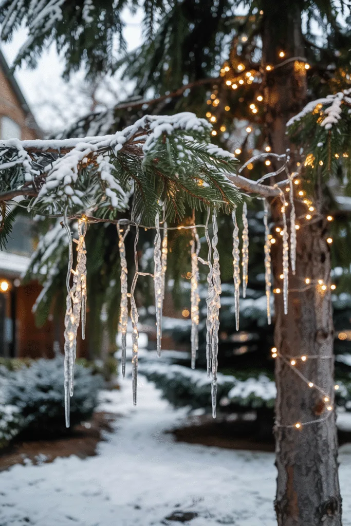 Adorn your outdoor tree with cascading icicle lights to evoke a frosty, winter wonderland vibe. These lights, designed to resemble dripping icicles, hang vertically from branches, creating a stunning curtain-like effect. Opt for cool white or blue lights to enhance the icy aesthetic, perfect for snowy climates. Secure the lights to sturdy branches to withstand wind, and pair with silver or white ornaments for a cohesive look. This style is ideal for front yard trees visible from the street.
