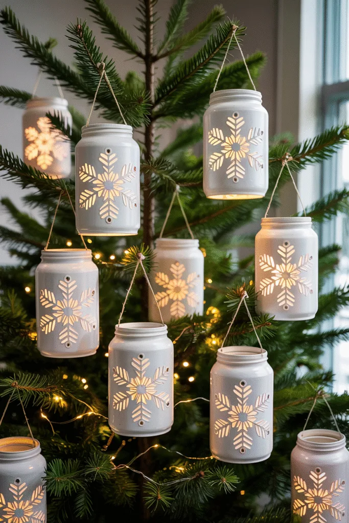 Craft DIY snowflake lanterns using templates, metal cans, or mason jars, and place battery-operated fairy lights inside. Hang these glowing lanterns from your indoor or outdoor tree for a charming, handmade touch. The perforated snowflake designs cast intricate patterns when lit, adding whimsy to your display. Group multiple lanterns at varying heights for a dynamic effect.