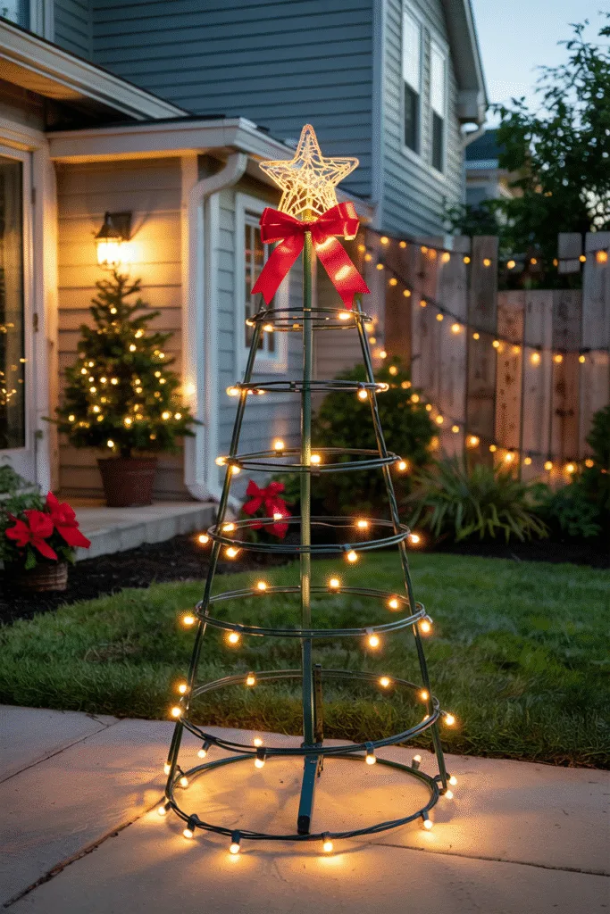 Create a budget-friendly outdoor Christmas tree using a tomato cage, zip ties, and string lights. Wrap warm white or multicolor LED lights tightly around the cage, securing them with zip ties, and top with a star or bow. This DIY project is perfect for small yards or patios, offering a charming, homemade touch. Place the light tree near your front door or along a walkway to guide guests with festive cheer. Add faux greenery or tinsel for extra texture.