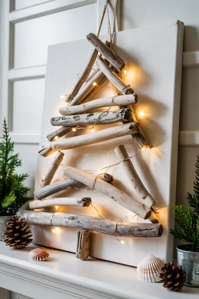 Create a unique indoor Christmas tree by arranging driftwood pieces in a triangular shape on a canvas, securing them with wire, and wrapping with fairy lights. This DIY project is perfect for coastal or rustic homes, blending natural elements with soft lighting. Add small seashell ornaments or pinecones for texture. Hang the canvas on a wall or prop it on a mantel for a non-traditional tree that’s both artistic and festive.