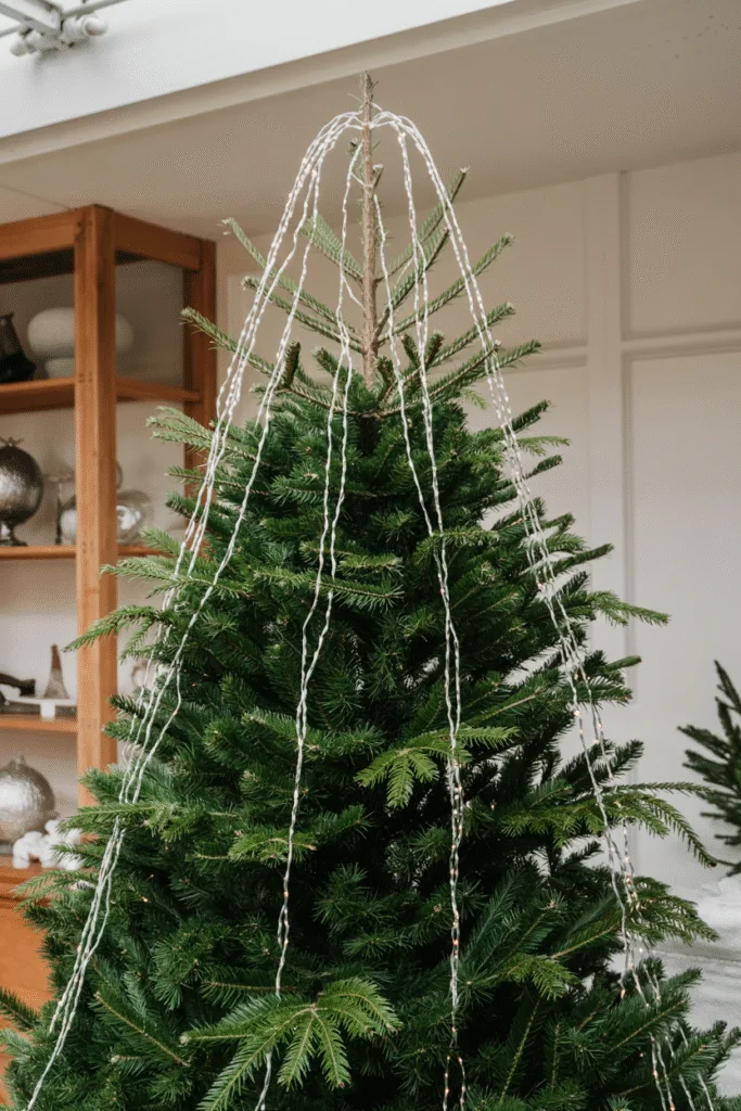 For a sleek, modern indoor tree, drape cool white LED lights in a cascading pattern from the top down, letting them flow loosely like a waterfall. This minimalist approach emphasizes clean lines and a crisp, icy aesthetic. Pair with simple silver or glass ornaments to maintain the understated elegance. This style suits contemporary homes and creates a serene, sophisticated holiday vibe.