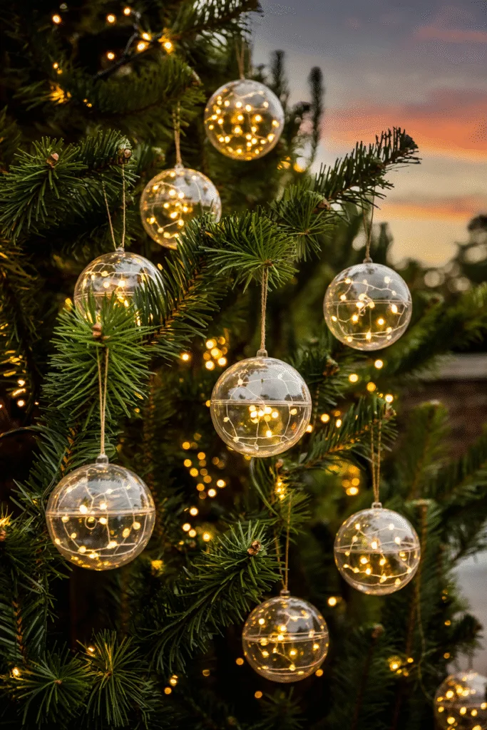 Hang solar-powered starlight spheres from your outdoor tree for an eco-friendly, enchanting display. These spherical ornaments, filled with mini LED lights, create a starry effect when hung among branches. Their solar power eliminates the need for outlets, making them ideal for remote yard areas. Group them in odd numbers for a balanced look, and pair with warm white string lights for a cohesive glow.