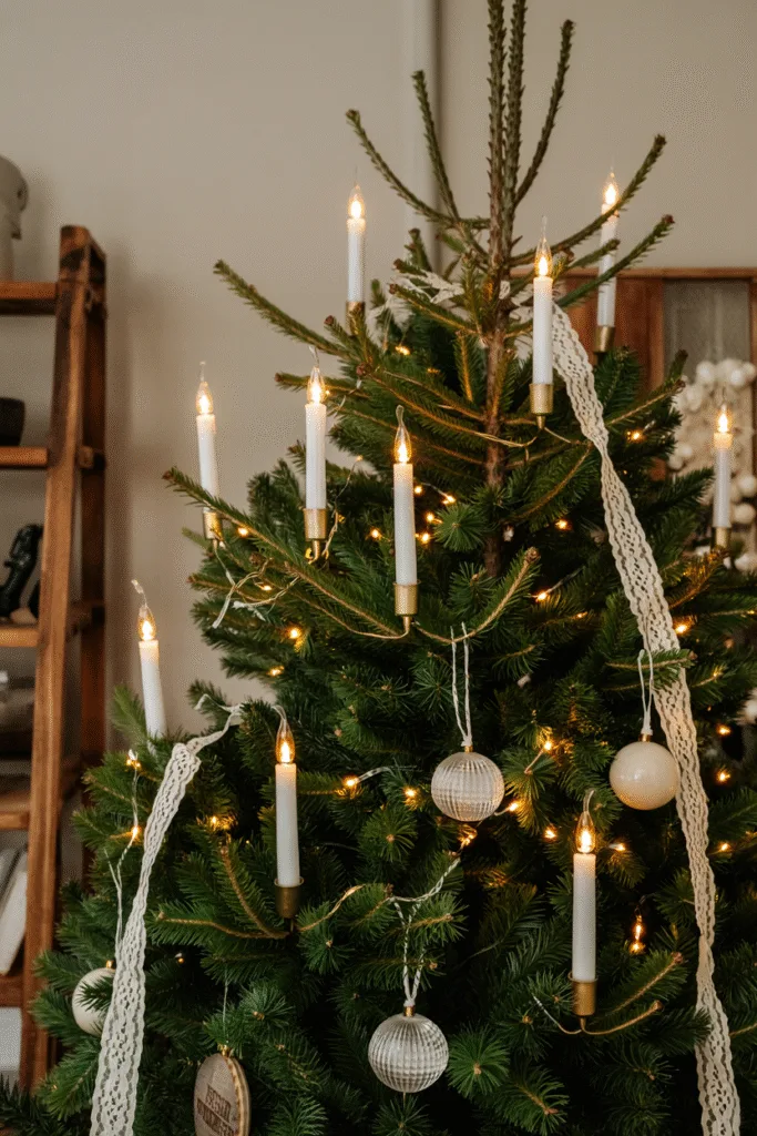 Recreate a nostalgic, vintage vibe by using LED clip-on candle lights on your indoor tree. These lights mimic the look of traditional candles, offering a warm, flickering glow without the fire hazard. Arrange them evenly across the branches and pair with lace ribbons, wooden ornaments, or vintage glass baubles for a cozy, old-world charm. This style is perfect for farmhouse or traditional decor.