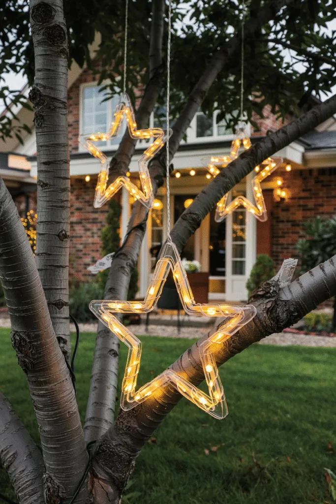 Use weatherproof LED rope lights to create festive silhouettes, such as stars or mini trees, on your outdoor tree. Wrap the rope lights around wire frames to form shapes, then hang them from branches or secure them to the trunk. This bold, graphic approach adds a modern touch to your yard and is visible from a distance, making it ideal for large properties.