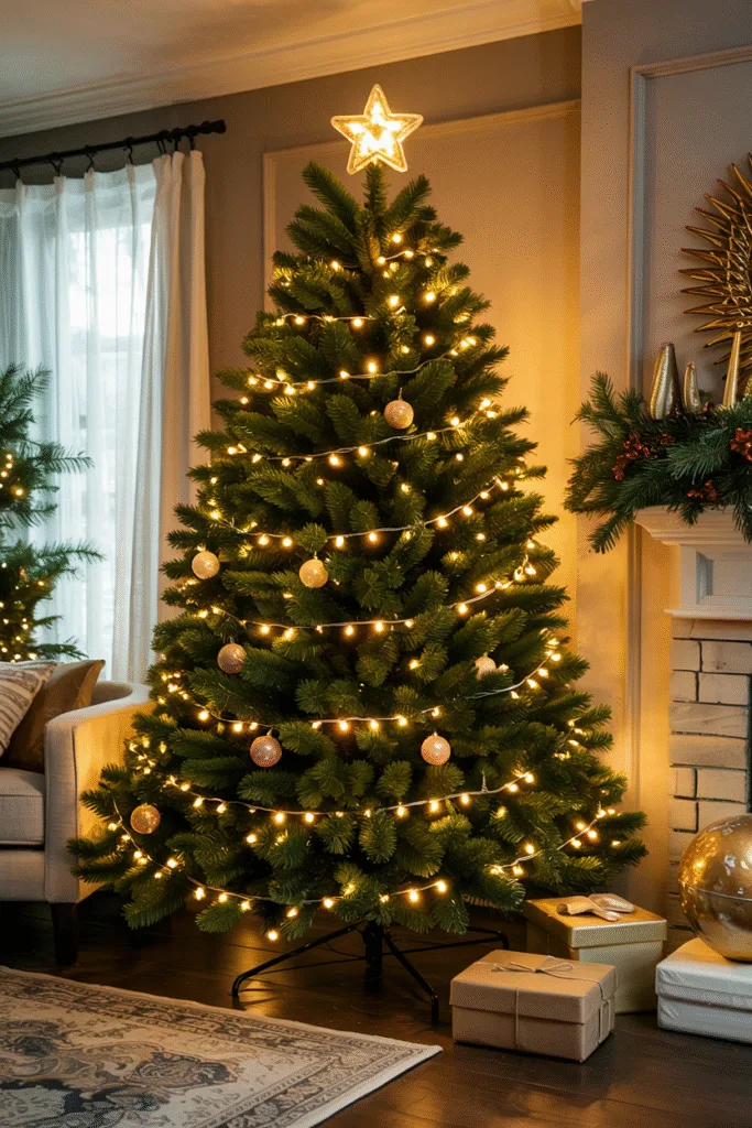 Wrap your indoor Christmas tree in warm white LED string lights, spiraling from the base to the top for a timeless, cozy glow. This classic style emphasizes elegance and simplicity, creating a soft ambiance that complements traditional holiday decor. Start at the trunk and wrap outward, ensuring even spacing for a balanced look. Add gold or silver ornaments to enhance the warm tones, and top with a glowing star for a polished finish. This setup works beautifully in living rooms, where the warm light reflects off metallic decorations, creating a magical sparkle.
