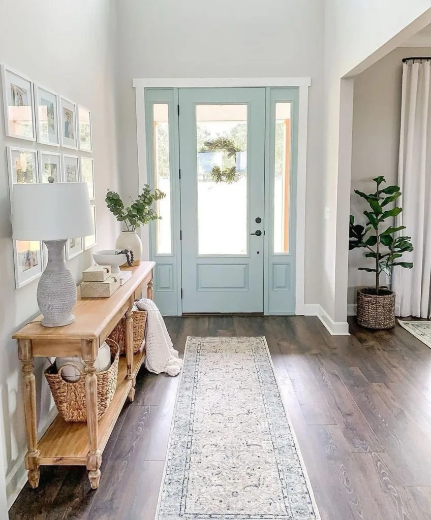 Porcelain tile or LVP—both waterproof, scratch-resistant, and gorgeous. Avoid real hardwood in high-traffic entries.