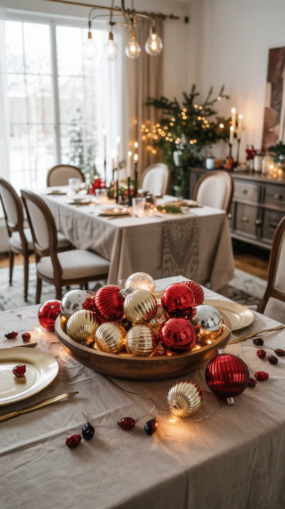 I love digging through my collection of vintage Christmas ornaments for this idea. I arrange a mix of colorful glass baubles—red, gold, and silver—in a shallow wooden bowl as the table’s centerpiece. I nestle tiny fairy lights among the ornaments, creating a twinkling effect that feels nostalgic. The bowl sits on a linen tablecloth, and I scatter a few dried cranberries around it for a festive pop of color, making the table feel like a cherished family heirloom.