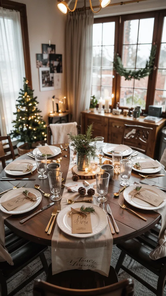 To add a personal touch, I craft place cards for each family member using kraft paper and calligraphy pens. I tie a small sprig of rosemary to each card with twine, adding a fragrant, herbal note that screams Christmas. Placing these at each setting makes everyone feel special, and the natural elements tie the table together, creating a warm, inviting atmosphere as we sit down to eat.