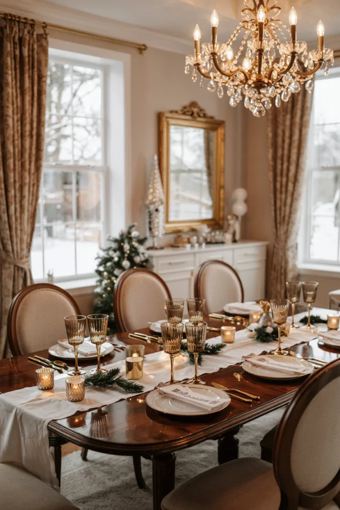 For a touch of sophistication, I bring out my collection of gold-rimmed glassware. The subtle shimmer of the gold against clear wine glasses and water goblets elevates the table without feeling overly formal. I pair them with simple white plates and gold utensils, creating a cohesive look that sparkles under the dining room’s chandelier. It’s a perfect blend of elegance and family-friendly warmth for our Christmas feast.