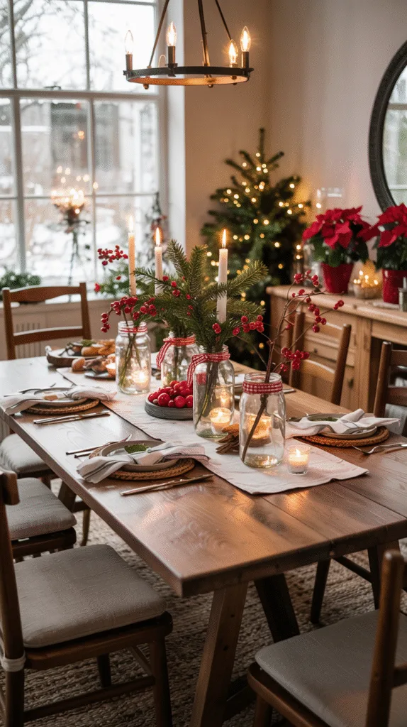 I transform simple mason jars into glowing candle holders for a cozy, homemade vibe. I fill each jar with a mix of red winter berries, pine clippings, and a tea light candle. Placed along the table, these jars cast a warm, flickering light that makes the room feel intimate. I tie a piece of red-and-white checkered ribbon around each jar to add a festive touch, tying into the holiday spirit.