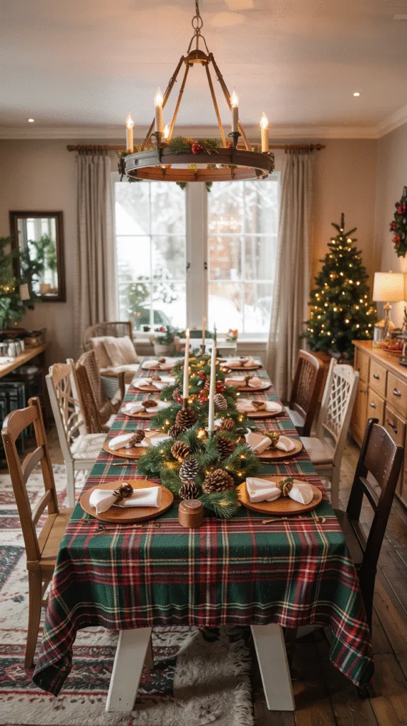 I adore the classic look of a plaid tablecloth for Christmas. I choose one in red, green, and white, laying it across my dining table for a bold yet timeless base. To keep it from feeling too traditional, I pair it with neutral accents like cream-colored napkins and wooden napkin rings. A simple garland of pinecones and fairy lights runs down the center, making the table feel festive and welcoming.