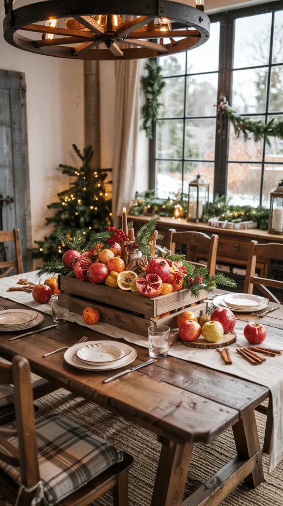 I repurpose a small wooden crate as a unique centerpiece, filling it with seasonal fruits like pomegranates, oranges, and apples. I tuck in sprigs of holly and a few cinnamon sticks for a festive scent. The crate sits on a woven runner, and I add a few battery-operated candles around it for warmth. This rustic, abundant display feels like a nod to family gatherings of old, perfect for our 2025 celebration.