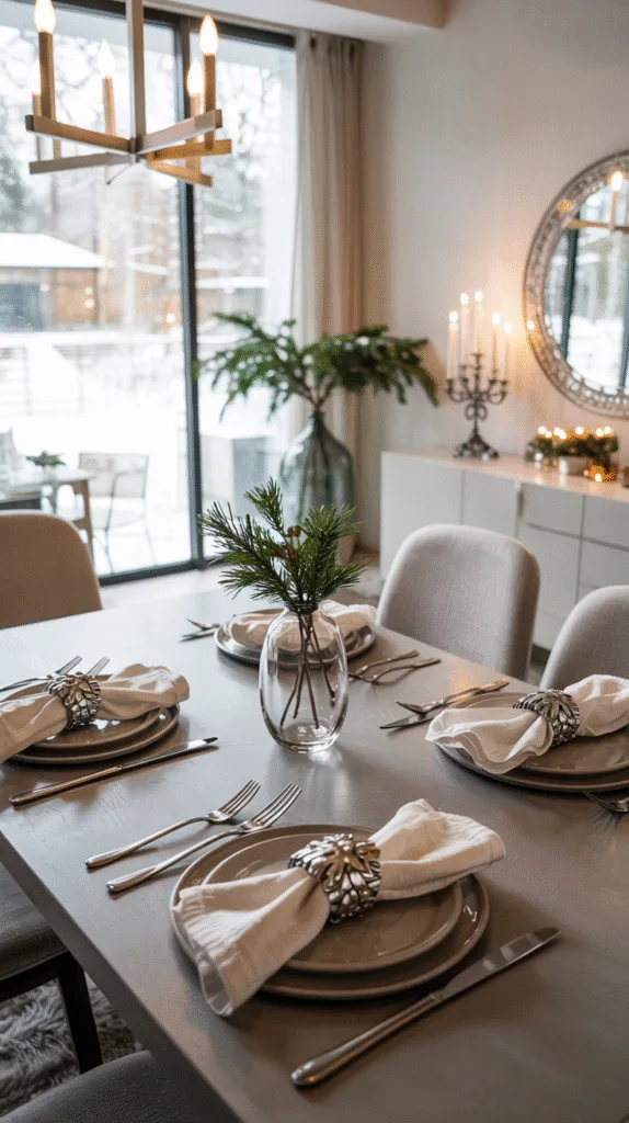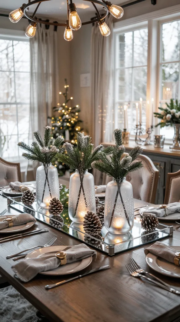 I fill frosted glass vases with pinecones and sprigs of faux snow-dusted pine for a wintery centerpiece. The vases sit on a mirrored tray that reflects the candlelight, amplifying the cozy glow. I add a few silver ornaments to the mix for a touch of sparkle, creating a frosty, elegant look that complements the holiday season while keeping the table inviting.