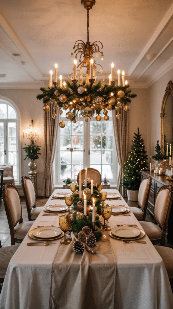I transform my dining room chandelier into a festive focal point by hanging lightweight Christmas ornaments—think mini gold and silver baubles—from its arms. I wrap the chandelier with thin garlands of faux greenery and add small LED candles for a warm glow. The effect is stunning, casting a festive light over the table and making our Christmas dinner feel grand yet cozy.