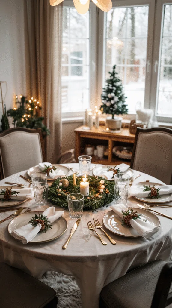 I drape a lush evergreen garland down the length of my dining table, weaving in delicate fairy lights for a soft, glowing effect. I add small red bows and clusters of pinecones to the garland, keeping it festive yet natural. The greenery fills the room with a fresh, piney scent, and the lights create a warm ambiance that makes our family dinner feel like a holiday dream.