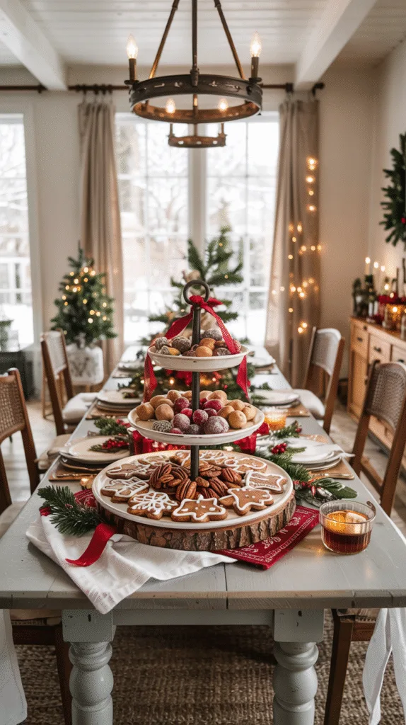 I set up a three-tiered stand in the center of the table, filling it with holiday treats like gingerbread cookies, candied pecans, and sugared cranberries. I decorate the stand with small pine sprigs and red ribbon, making it both functional and festive. The stand becomes a conversation piece as my family nibbles on treats throughout dinner, adding a sweet touch to our gathering.