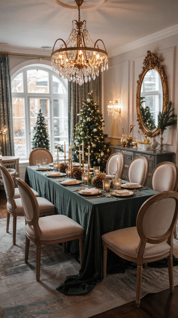 For a touch of luxury, I lay a deep green velvet table runner across my dining table, its rich texture adding warmth. I sprinkle gold-painted pinecones and small glass votives along the runner, creating a glamorous yet cozy centerpiece. The runner pairs beautifully with white plates and gold utensils, making our Christmas dinner feel like a special occasion.