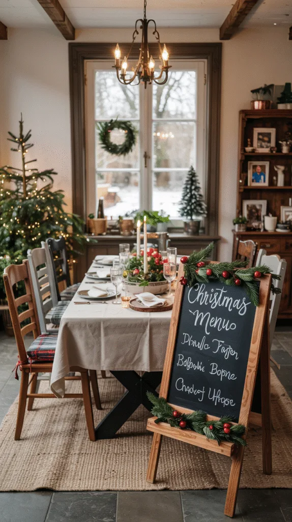 I create a chalkboard menu display to showcase our Christmas dinner menu, writing out dishes like roasted turkey and cranberry sauce in festive calligraphy. I frame the chalkboard with a garland of pine and red berries, placing it on a small easel at the end of the table. This personal touch makes the meal feel curated and adds a charming, rustic element to the decor.