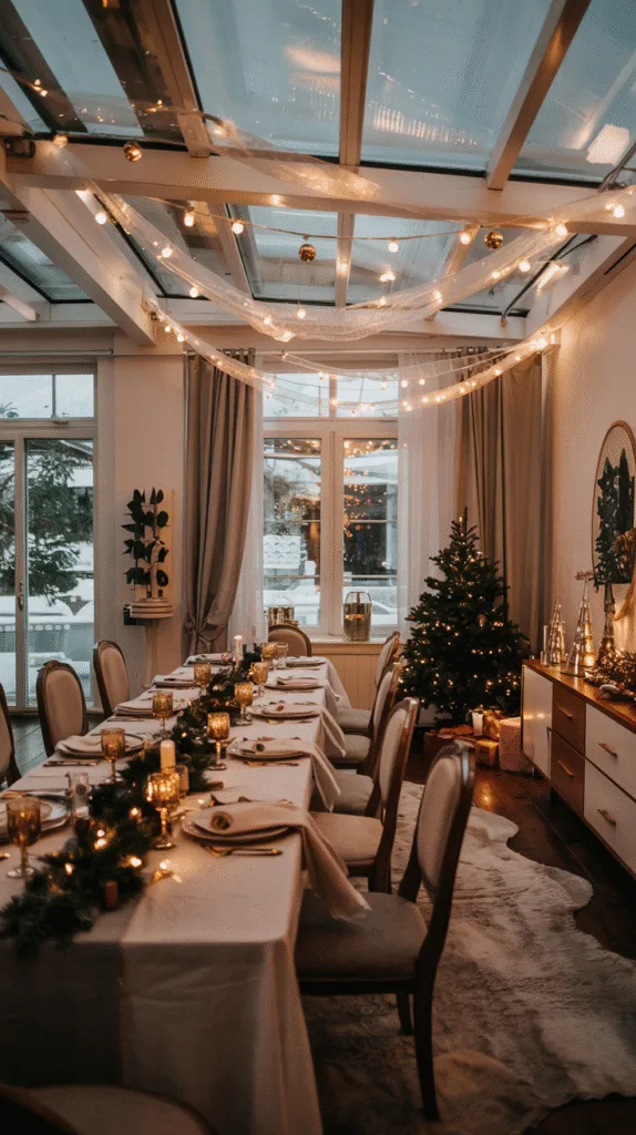 I create a magical atmosphere by hanging string lights above the dining table, forming a canopy that casts a warm, twinkling glow. I drape lightweight tulle fabric between the strands for a soft, ethereal effect, tying in small gold ornaments for a festive touch. The canopy makes our Christmas dinner feel like a starry night, enveloping my family in a cozy, enchanting ambiance.