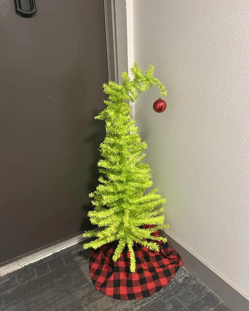 Secure the tree in a heavy base—Grinch trees love to lean. Use clear fishing line anchored to a ceiling hook or wall if you want a dramatic 45-degree angle without toppling.
