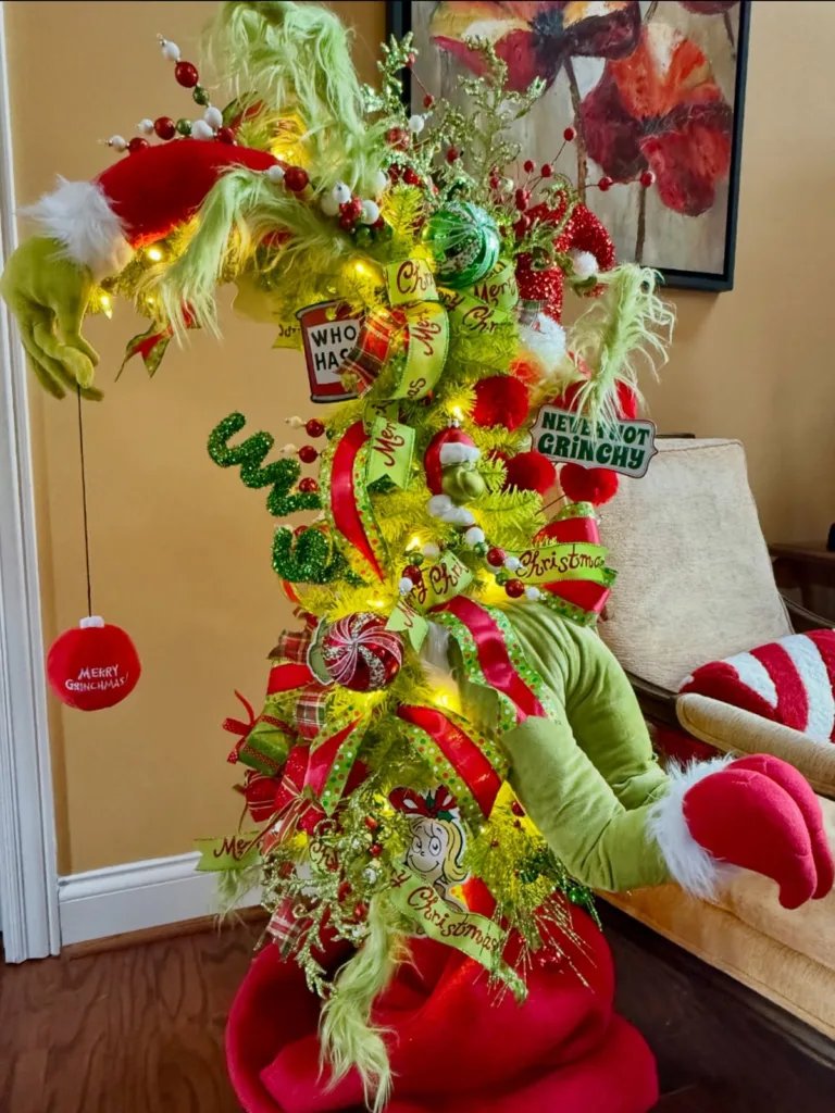 A plush Grinch arm reaching down from the ceiling, “stealing” the top ornament—hilarious and Instagram gold.