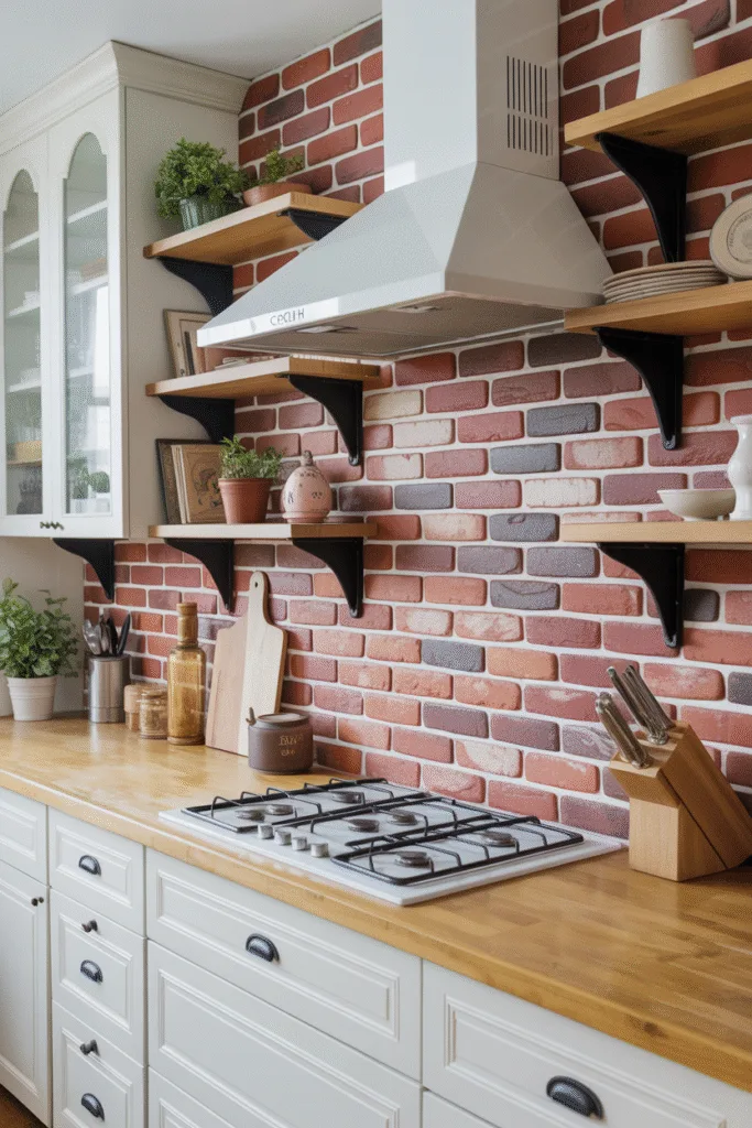 Brick backsplashes, whether real or faux, bring industrial or rustic charm to the kitchen. Exposed brick with natural red tones adds warmth, while whitewashed or painted brick offers a modern, airy feel. Faux brick panels are easier to install and maintain, making them a practical choice for DIY enthusiasts. This backsplash idea pairs well with open shelving and vintage accents, creating a cozy, inviting atmosphere. Sealing the brick ensures it’s resistant to grease and stains.