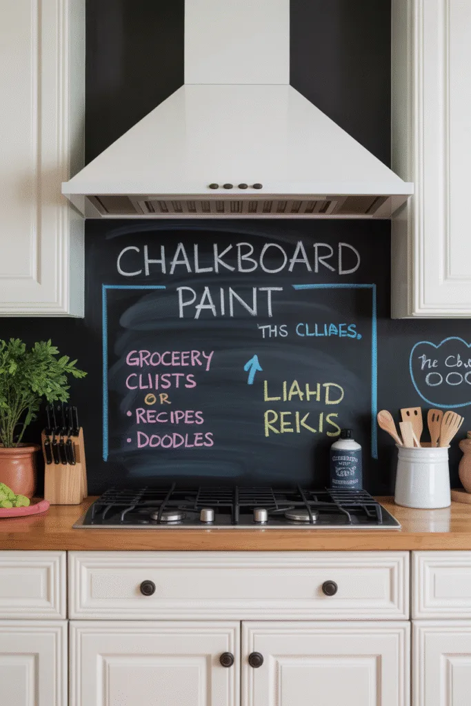 For a functional and playful backsplash, chalkboard paint offers a unique, interactive option. Paint an accent wall or the entire backsplash area with chalkboard paint to create a space for grocery lists, recipes, or doodles. This idea is ideal for families or creative homeowners who want a customizable surface. Pair with colorful chalk or liquid chalk markers for a vibrant look. While not as durable as tiles, chalkboard paint is easy to clean and refresh with a new coat when needed.