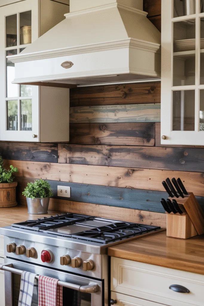 For a rustic or farmhouse-style kitchen, reclaimed wood panels offer warmth and texture. Weathered barn wood or distressed planks create a cozy, lived-in feel, perfect for pairing with vintage-inspired fixtures or butcher block countertops. While wood is less resistant to moisture and stains, applying a protective sealant ensures durability. This eco-friendly backsplash idea appeals to those who love sustainable design and want to bring natural elements into their kitchen.