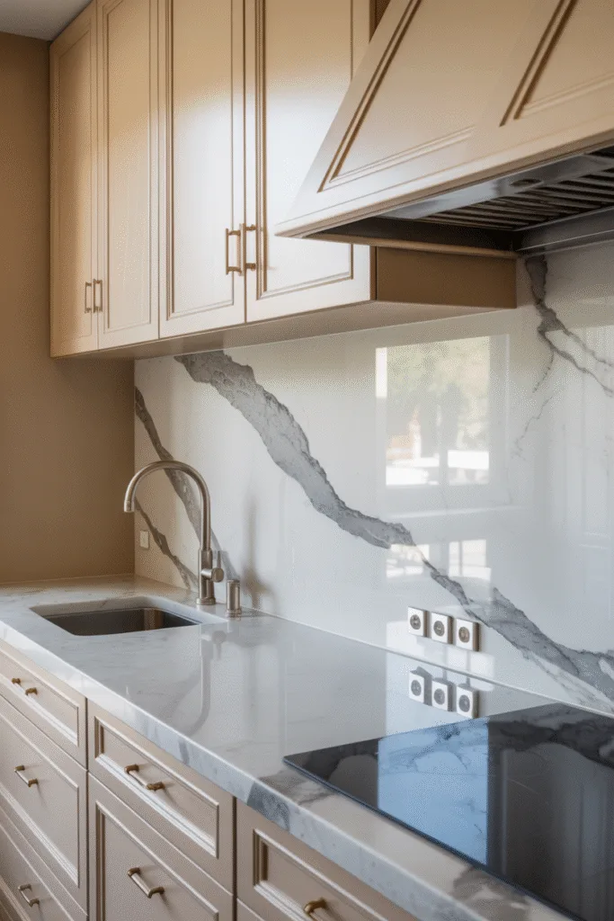 For a seamless, high-end look, natural stone slabs like marble, granite, or quartzite make a bold statement. Extending the countertop material to the backsplash creates a cohesive design, ideal for contemporary or luxury kitchens. Marble slabs with soft veining add elegance, while granite offers durability and a range of color options. Though pricier and requiring regular sealing, stone slabs are heat- and stain-resistant when properly maintained. This backsplash idea is perfect for those who want a polished, monolithic aesthetic that exudes sophistication.