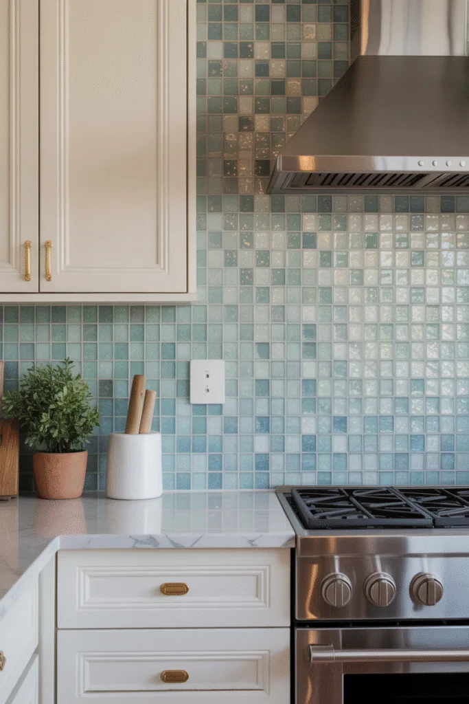 Glass mosaic tiles add a shimmering, luxurious touch to any kitchen. Available in a range of colors, from soft pastels to bold jewel tones, these small tiles create a reflective surface that enhances light and depth. Their glossy finish is easy to clean, making them ideal for busy kitchens. Arrange them in a grid, herringbone, or random pattern for varied effects. For a modern look, pair metallic or iridescent glass tiles with sleek stainless steel appliances. This backsplash idea is perfect for homeowners seeking a balance of glamour and practicality.