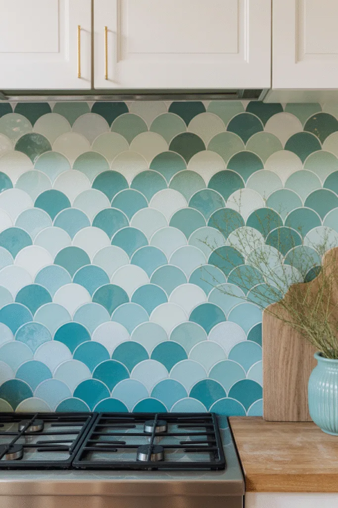 Inspired by Moroccan design, fish scale (or scallop) tiles offer a whimsical, organic shape that softens the angular lines of a kitchen. Available in ceramic, porcelain, or glass, these tiles create a wave-like pattern that adds movement and texture. Soft colors like seafoam green or pale blue evoke a coastal vibe, while bold hues like cobalt or terracotta suit eclectic spaces. Though installation can be more complex due to their curved edges, the result is a stunning, artistic backsplash that feels both modern and timeless.