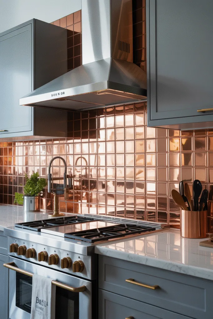 Metallic tiles, such as stainless steel, copper, or brass, add an industrial-chic vibe to your kitchen. These tiles reflect light, creating a dynamic, modern aesthetic that pairs well with sleek appliances and matte cabinetry. Copper tiles develop a natural patina over time, adding warmth and character, while stainless steel offers a clean, professional look. Metallic tiles are durable and easy to clean but may require polishing to maintain their shine. This backsplash idea is ideal for urban lofts or contemporary homes seeking a bold, reflective surface.